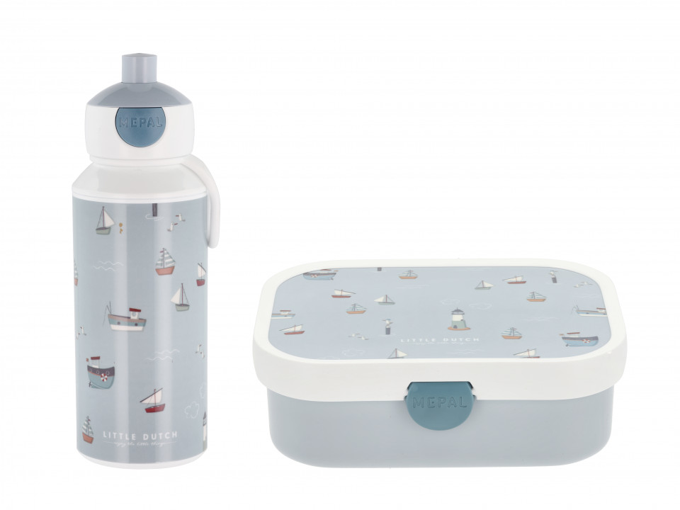 Praktisk sett med matboks og drikkeflaske fra Mepal med Sailor Bay campus motiv. Settet består av to deler: en matboks med en liten gaffel og løs innsats med to små rom, og en drikkeflaske på 400 ml med et smart popup-system med munnstykke som enkelt utløses ved å trykke på en knapp.
