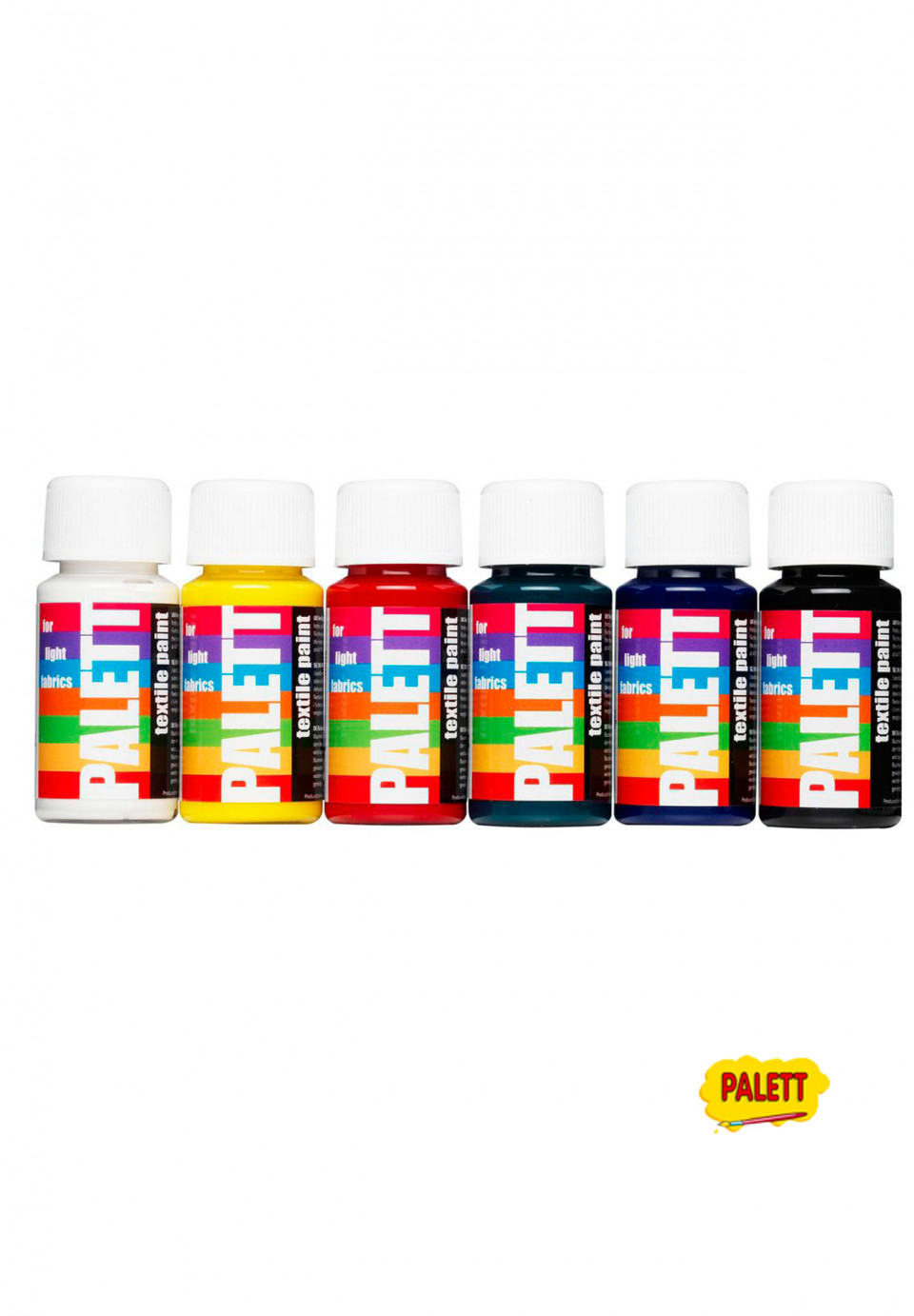 Palett tekstilmaling 6-pk, til dekorering på lyse stoffer (bomull og polyester). Hvit, blandegul, rød, blå, grønn og sort. Alle tekstiler bør vaskes før de males. Når fargen har tørket, strykefikseres den på vrangen i ca. 3-5 minutter med strykejernet innstilt på bomull. Etter 24 timer tåler malingen maskinvask i 40°C. 6 farger à 50 ml.